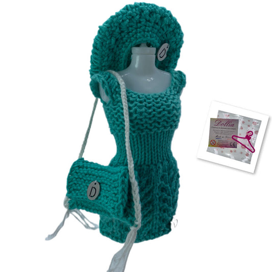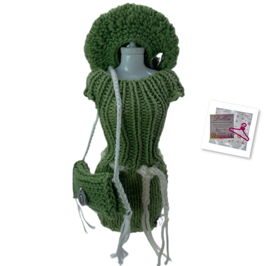 Ensemble robe,beret et sac pour poupée sans fermeture fait main-Made in France